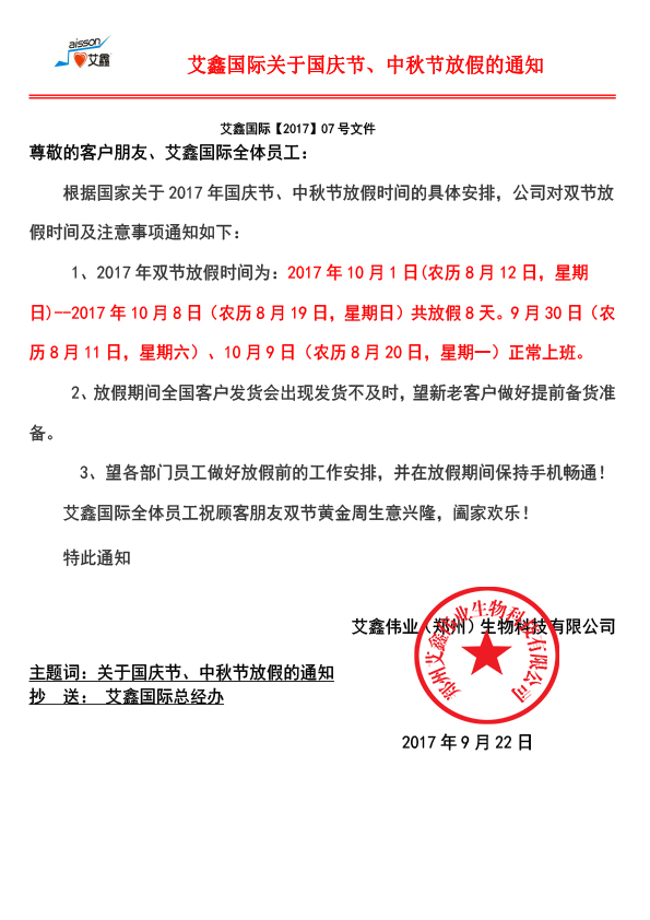 艾鑫國際關于2017年國慶節、中秋節放假安排的通知